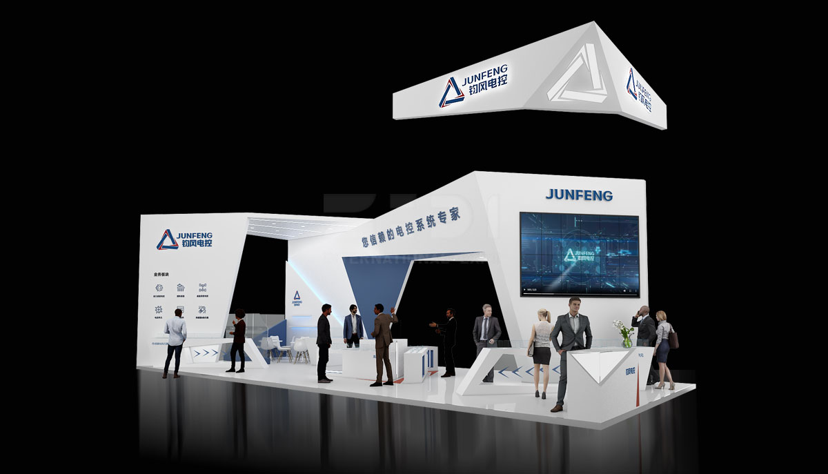 本次“均風(fēng)電控”展臺占地面積為90平方米,色調(diào)主要以白色為主,主體結(jié)構(gòu)為:木結(jié)構(gòu)+表面乳膠漆 其他材質(zhì)包括:發(fā)光字 雪弗板字 烤漆 地臺表面淺色地板等。
